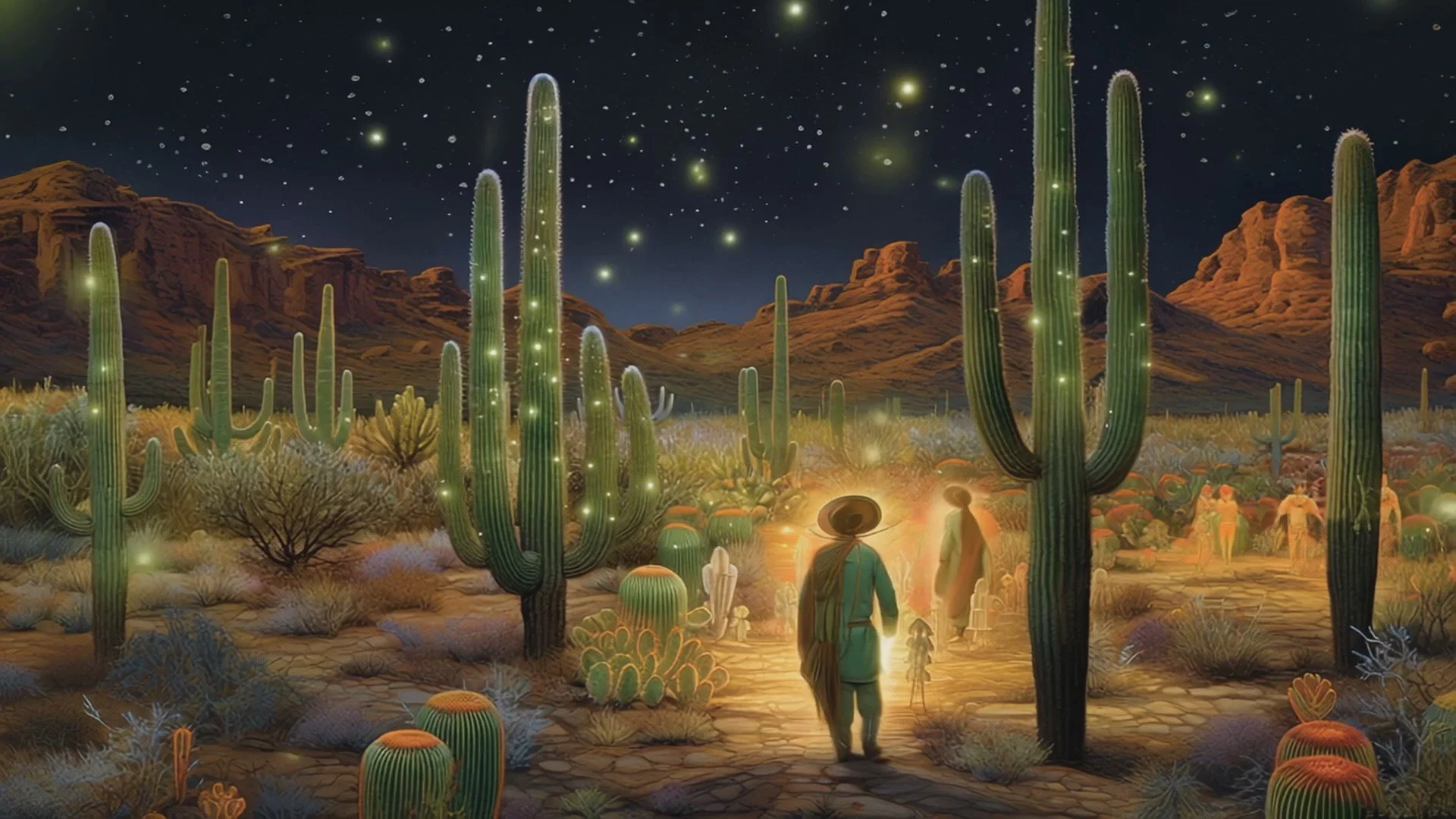 Cruce del Coyote is one chapter in a multi-part live cinema work titled fEVER. This larger work, part animated graphic novel, part opera, imagines the southwestern borderlands as a continuum without walls, checkpoints or limiting beliefs. A place that stretches far back and far forward in time. A land that is as alive as the many cultures who have traversed her surface, lived in her mountains and learned to speak with the plants. In this chapter, Coyote is our guide, slipping effortlessly across time and between worlds, between dimensions. Coyote watches the ancient indigenous groups walking through the desert collecting cactus, the penitentes gathering branches, star-people scanning the surroundings and other, more recent immigrants, adapting to an animate world of vibrant energetic connection.